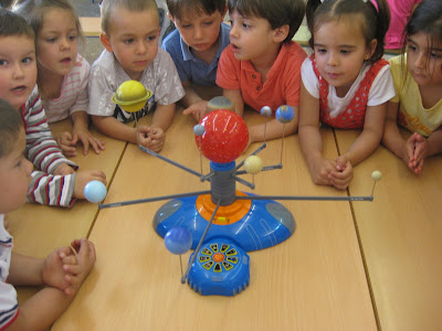 Hoy hemos empezado nuestro viaje por el espacio. Hemos pasado muy cerquita de Orión y otras muchas estrellas de las que hemos conocido su nombre. Hemos acariciado casi, casi...La Luna, el Sol y los anillos de Saturno....Hemos podido ver incluso la estrella polar y muchas constelaciones....Juan nos cuenta que "las constelaciones son estrellas que se juntan y hacen formas, como un platano, un tomate una patata....y hasta un dragón" está en lo cierto, aunque creo que la aconstelación del tomate no aparece por ningún sitio, pero ¿quien sabe? Creo que tendremos que investigar un poquito más a través de este fantástico viaje.